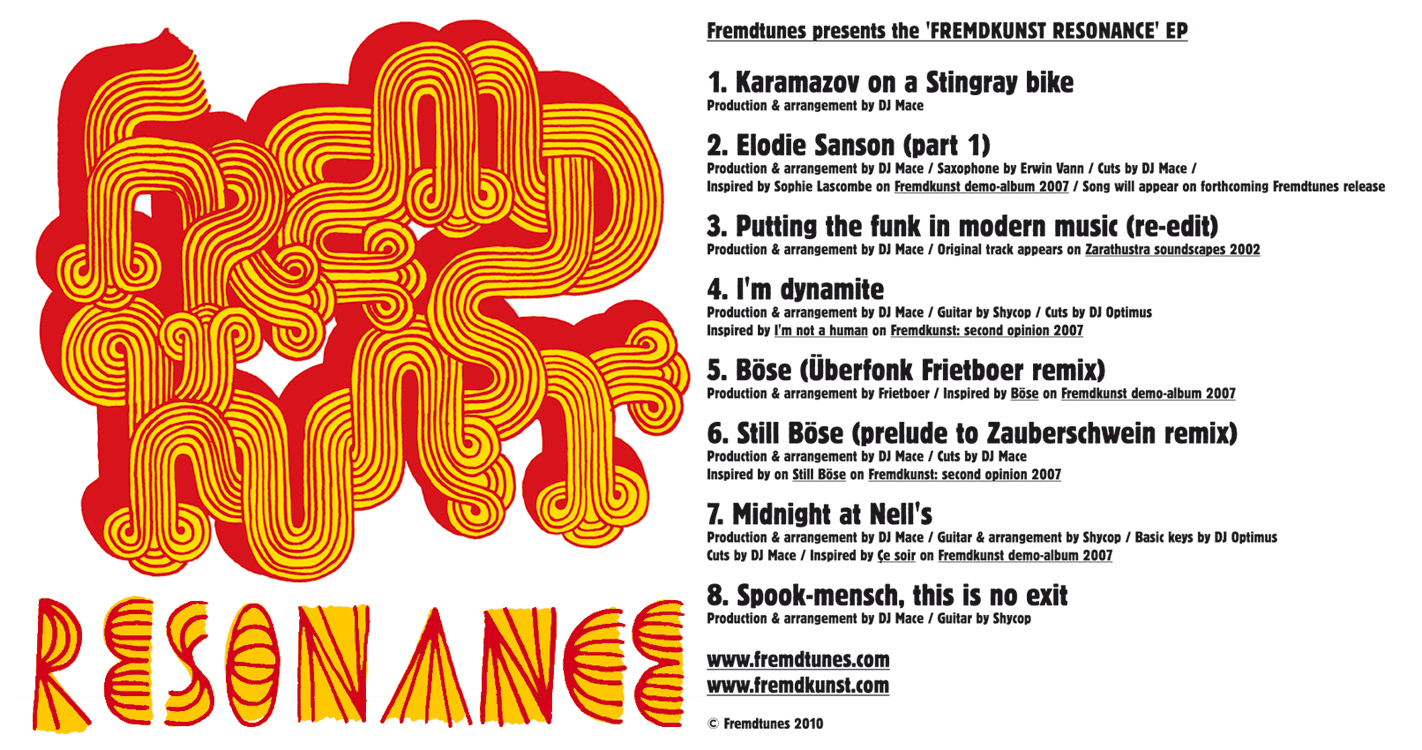 ‘Fremdkunst resonance’ is a mix of old, new and revised tracks and preludes the album ‘Fremdkunst: b-beats & soundscapes’ which will be released in September 2010. The EP consists of funky, jazzy, bit-crushed, distorted, noise-generated, over-compressed, spaced-out beats. DJ Mace produced most songs and was assisted by DJ Optimus, Erwin Vann, Frietboer and Shycop. The EP resonates the sound of previous Fremdkunst tracks and Mace was inspired by The Twilight Zone and the works of Double Dee & Steinski and Bret Easton Ellis. Only the first 100 visitors can download the EP – for free!